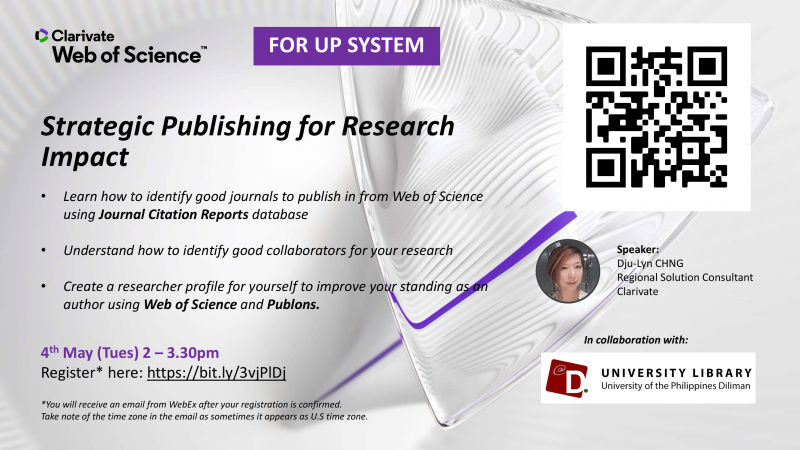 Clarivate invites the UP System community (faculty members, students, and staff) to the second part of the product training for Clarivate’s Web of Science (WOS) entitled Strategic Publishing for Research Impact on Tuesday, 4 May 2021 from 2:00 p.m. – 3:30 p.m. via Cisco Webex Training. The training will be facilitated by Ms. Dju-Lyn Chng, Regional Solution Consultant for Southeast Asia, Clarivate.