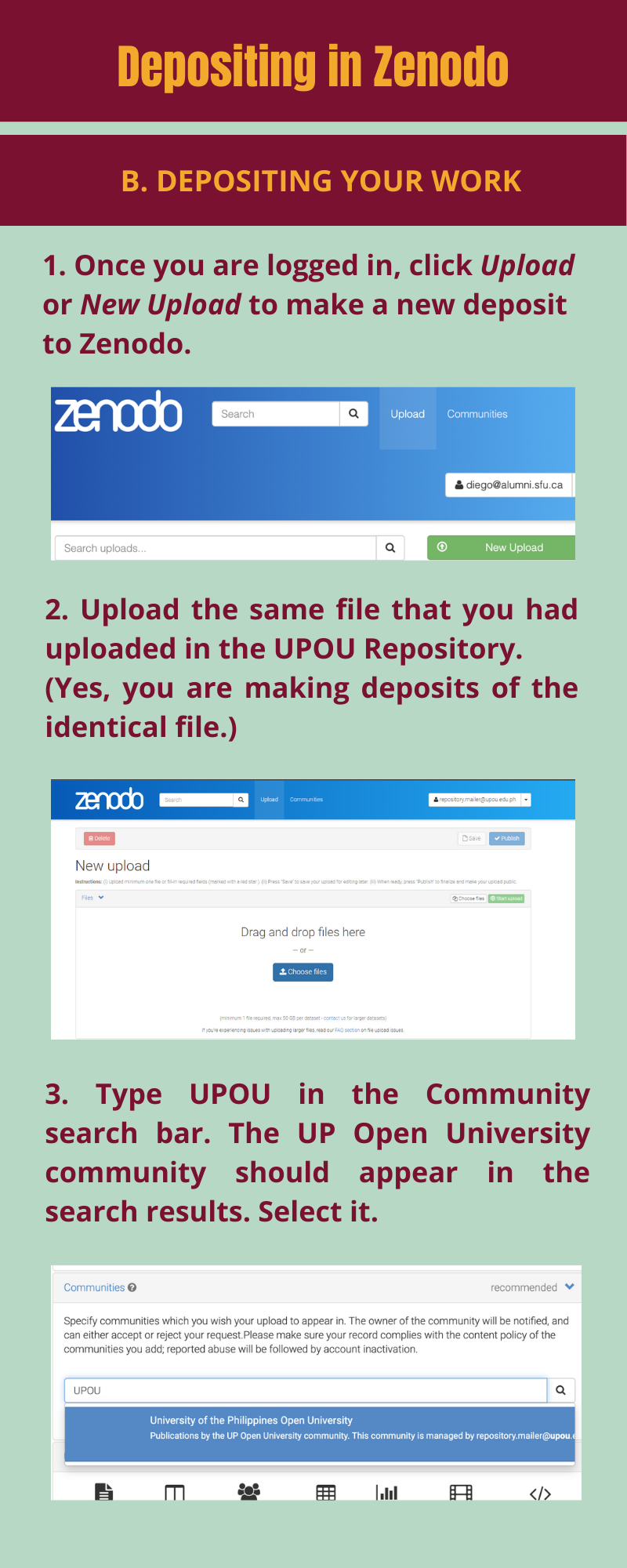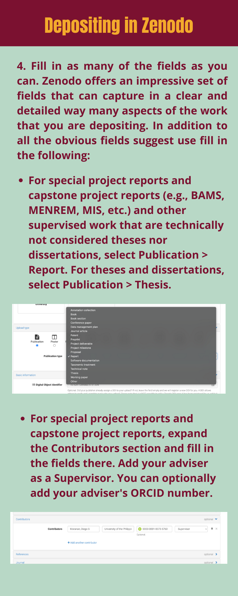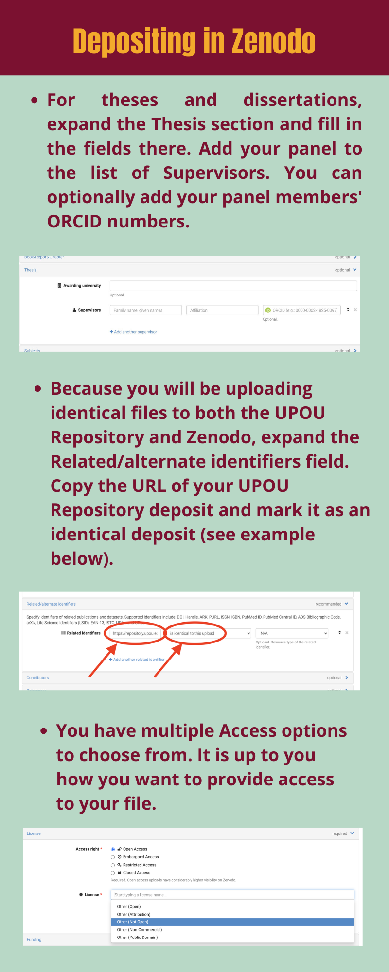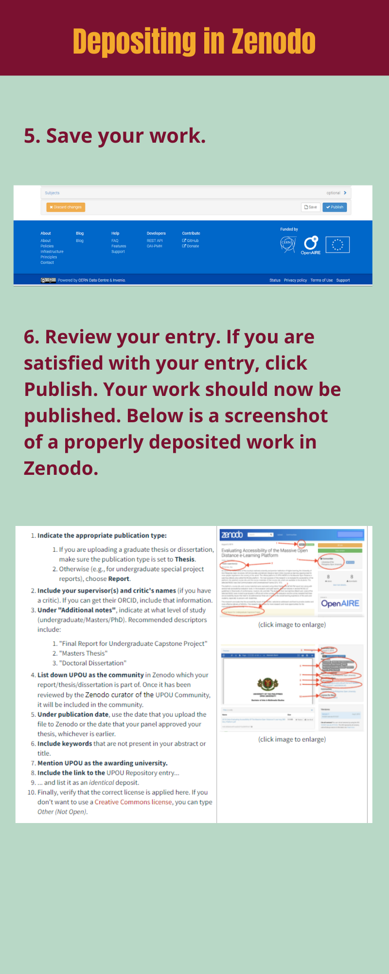 Here are the following steps you should take when you’re going to deposit your thesis, dissertation, special project or practicum report, capstone project report, and similar output in Zenodo: